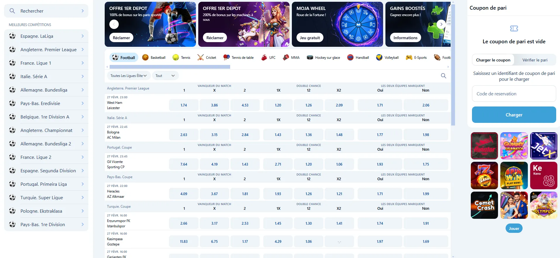 La section paris sportifs Mojabet met clairement le football au premier plan, discipline la plus suivie en République Démocratique du Congo. Les joueurs peuvent miser aussi bien avant le coup d’envoi (prématch) qu’en direct, avec des cotes ajustées en temps réel selon l’évolution du match.